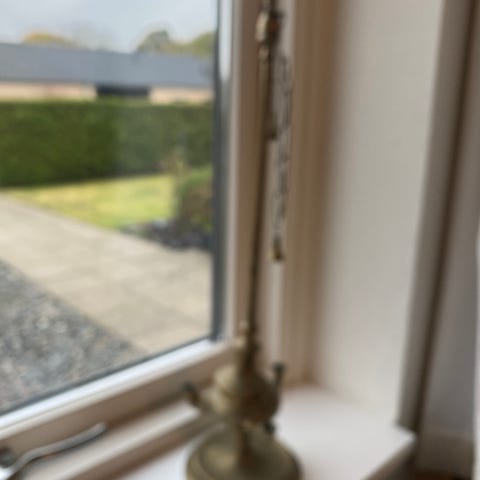 2 stk. messing olielamper fremstillet af patronhylstre med regiments emblem, Cirka 11 cm høje. Jeg har ikke tilstrækkelig viden til at kunne identificere hvilket regiment emblemet tilhører. Så vidt jeg kan se forestiller det en løve med krone og vinger, under denne Frederik d. 9's monogram.