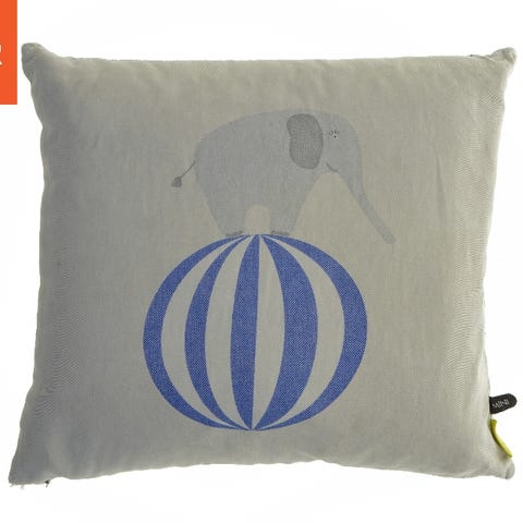 Grå med hvide striber. Bomuld. Betrækket kan tages af til vask.
