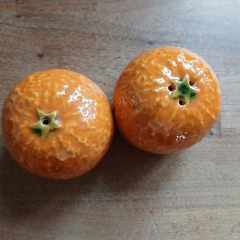 Salt / peber sæt i lyserøde nuancer. Beholderen forestiller en liggende kvindefigur, hvor de aftagelige dele fungerer som krydderistrøsere med huller i toppen. Undersiden har åbning til påfyldning af krydderier. Velegnet som bord- eller køkkendekoration og til opbevaring og dosering af tørre krydderier. Ca.-mål kan aflæses på billederne med tommestok.