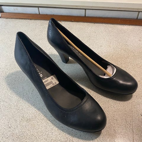 Tamaris højhælede sko i størrelse 38. Klassiske pumps i sort farve med lukket tå og hæl. Ydersål i syntetisk materiale og indersål med Tamaris-logo. Velegnet til brug ved både arbejde og mere formelle anledninger.