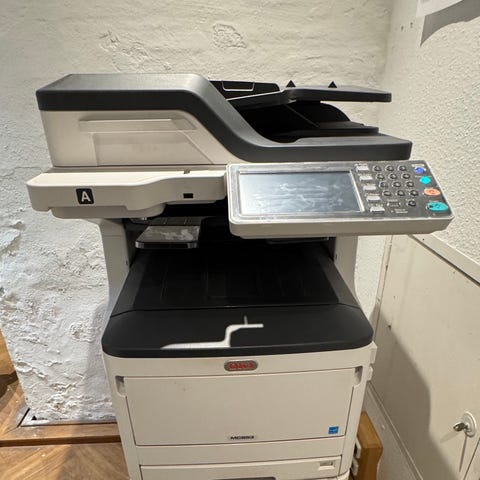 OKI MB472dnw multifunktionsprinter i hvid. Enheden kombinerer sort/hvid- og farve laserprint, kopiering, scanning og fax i én maskine. Den har dokumentføder øverst, kontrolpanel med display og flere funktionsknapper samt papirskuffe i bunden. Velegnet til kontorbrug, hvor der er behov for udskrivning, kopiering og scanning af dokumenter i A4-format.