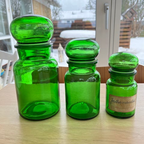 Har disse 2 smukke Apoteker glas, det grønne er belgisk og det gule er italiensk...pr stk 50 ..sender gerne m DAO