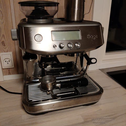 Sage Barista espressomaskine, som fungerer fint både til espresso og mælkeskum/steaming. Maskinen laver god kaffe og har kun få, normale brugsspor.