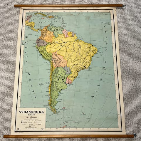 Trærammen er lidt bredere end kortet og monteret med beslag, der kan holde kortet sammenrullet.