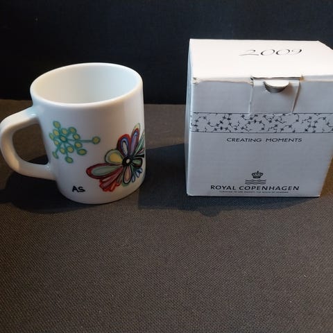 Lille årskrus designet af Sten Lykke Madsen. Royal Copenhagen krus nr 495 fra år 2002. Ca 7,5 cm højt og en diameter på 6,5 cm. Set til 400 kr.