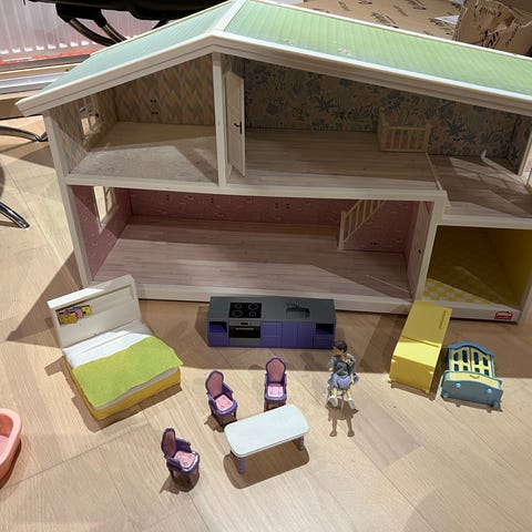 Lundby dukkehus bar med to matchende taburetter. Baren er udført i trælook med grønne og gyldne detaljer på fronten. Over disken er der hylder med faste flasker og glas som en del af indretningen. Møblet er beregnet som tilbehør til dukkehus og er i miniaturestørrelse egnet til leg og dekoration i Lundby dukkehuse. Lisa dukkehus bar, sjælden til salg. Men sælger min nu. Plus evt porto.