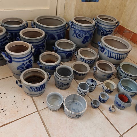 Stentøjskrukker i grålig tone med blå dekoration. Sættet består af to krukker i forskellig størrelse, begge med hank/hanke i siderne. Velegnet som køkkenkrukker, opbevaring eller dekoration i hjemmet.