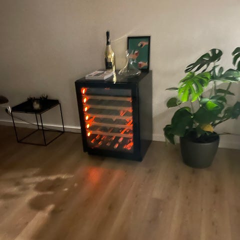 Vinkøleskab med glaslåge i sort. Skabet har flere træhylder til opbevaring af vinflasker liggende. Egnet til indendørs brug, eksempelvis i køkken eller stue, til tempereret opbevaring af vin og andre drikkevarer. Afhentes i NV og kan transporteres på vogn og i elevator til din bil.
