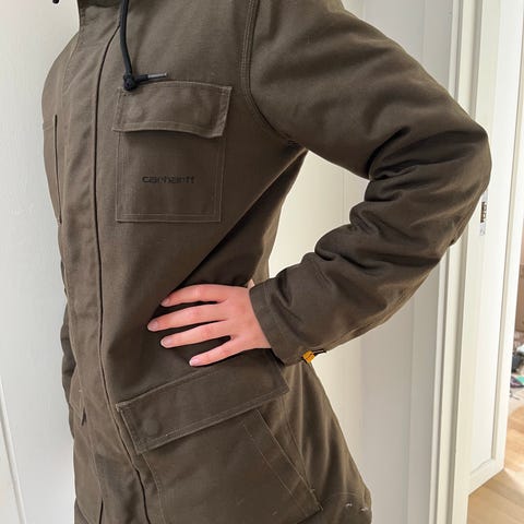 Carhartt sort lækker vinter dame frakke med pelskant på hætte. Str. XS.