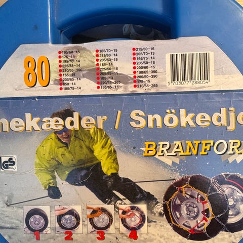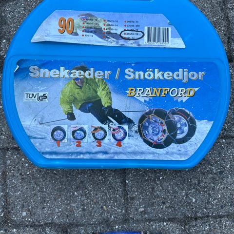 Brunford snekæder til bil. Sættet leveres i en blå plastkuffert med bærehåndtag. Kæderne består af metalled med farvede plastdele, som hjælper ved montering på dækkene. Velegnet til brug på sne- og isglatte veje, hvor ekstra vejgreb er nødvendigt. Dækspecifikke mål fremgår normalt af etiketten på kufferten og bør kontrolleres før brug for at sikre korrekt pasform til bilens dæk.