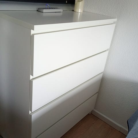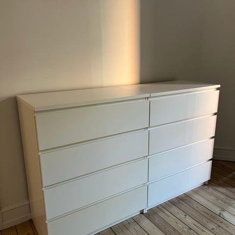 skab i hvid. Skabet består af to kubiske moduler, hvor det øverste modul har låge med hængsler i siden. Nederste modul fungerer som lukket opbevaringsenhed uden synlig frontåbning på billederne. Velegnet til opbevaring i stue, soveværelse eller kontor, f.eks. til bøger, tekstiler eller diverse småting. Overfladen fremstår glat og ensfarvet i hvid, og skabet kan placeres enkeltvis eller sammen med andet -opbevaringsmøblement.