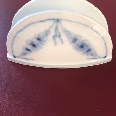Bing & Grøndahl porcelæn stel i hvid med blå dekoration. Sættet omfatter flere kopper med hank, tilhørende underkopper, dessert- eller frokosttallerkener, et serveringsfad med hank samt to små strøbøsser. Stellet er velegnet til servering af kaffe, te og kage eller som supplement til eksisterende Bing & Grøndahl stel i lignende dekoration.