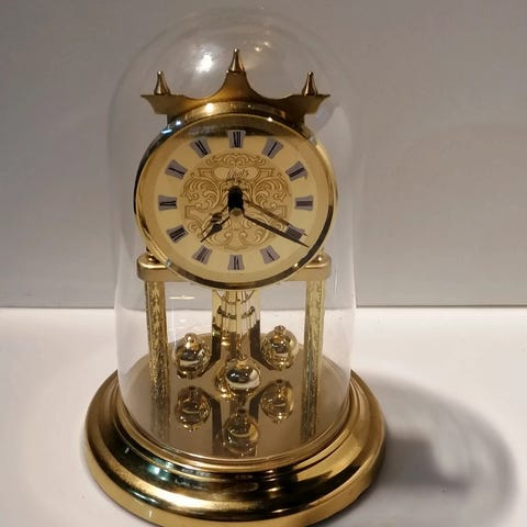 Elegant og dekorativt Schatz kuppelur med glasdome og flot finish. Uret har klassisk urskive med romertal og et smukt roterende pendul, som giver et eksklusivt og nostalgisk udtryk.