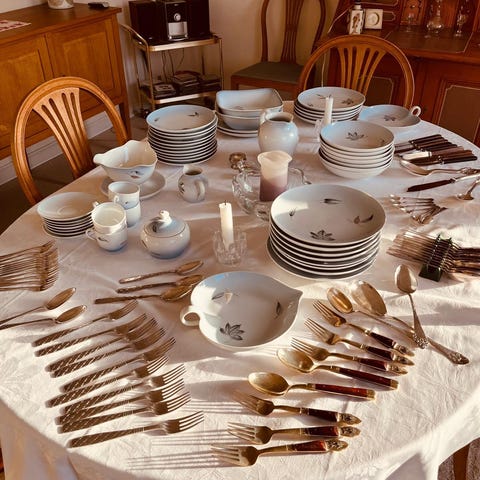 Smukt vintage serveringssæt bestående af flere dele (bl.a. kagespade, serveringsske/øse og små gafler).