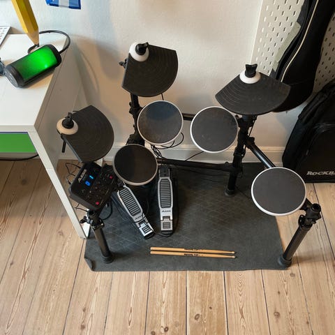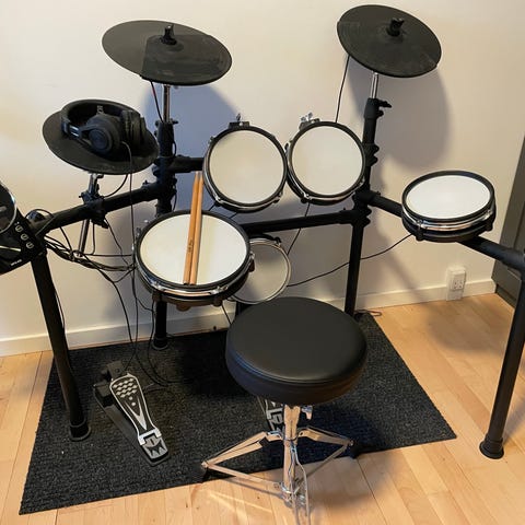 Elektrisk trommesæt der virker perfekt. Rigtig godt til en begynder. Inklusive stol.