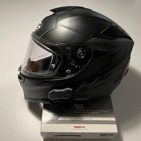HJC motorcykelhjelm i mat sort med klart visir. Hjelmen er en åbnbar model med front, der kan løftes op. Den har integreret mikrofon og højtalere til kommunikationsudstyr samt ventilation i front og top. Leveres med brugsanvisning fra HJC.