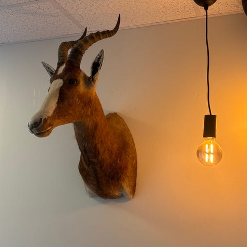 Trofæ af vandbuk i form af skuldermontage med lange, buede horn. Dyret er monteret på plade til ophæng på væg. Pelsen fremstår i naturlige brune nuancer med lysere partier omkring snude og ører. Egnet som dekorativ jagttrofæ- og samlergenstand til ophæng i eksempelvis stue, kontor eller jagtstue.