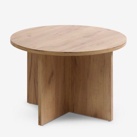 Flot rundt sofabord med bordplade i træ med mat sort top.