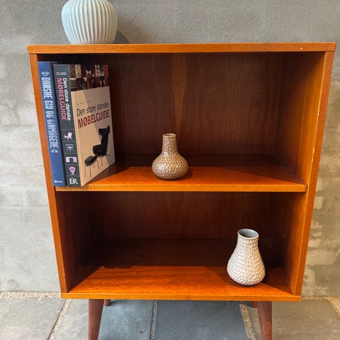 Super fin bogreol i teak. Måler i højden 81, bredde 160 og dybde 28. Reolen er i god stand med alm. aldersbetingede brugsspor