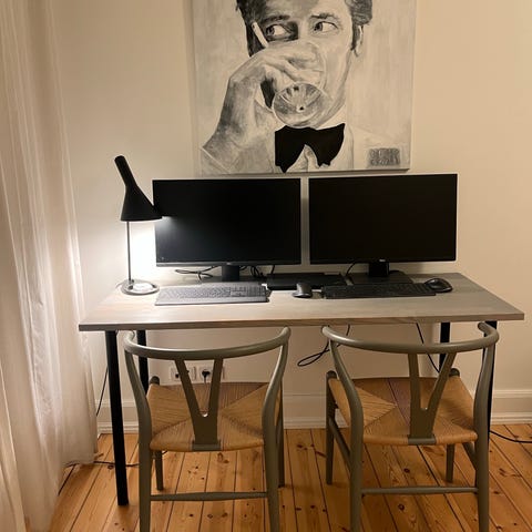 Sælger det her skrivebord med justerbare sorte ben.