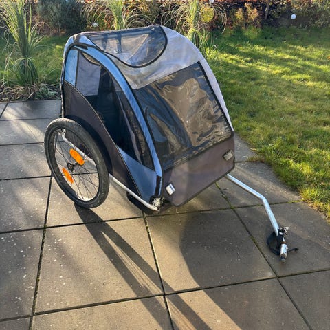 Cykelanhænger klapvogn til 2 børn i blå og grå. Modellen har tre hjul med store lufthjul bagtil og et mindre forhjul, som gør den egnet til brug som både cykelanhænger og barnevognslignende klapvogn. Kabinen har vinduer i sider og front samt overdækning med gennemsigtigt vindue foroven. Indvendigt er der to siddepladser med polstrede seler og nakkestøtter. Bagpå er der opbevaringslommer og refleksdetaljer. Samt håndbremse. Velegnet til transport af to børn på cykelture eller gåture løbeture Hedder NORTH 13.5 står som ny