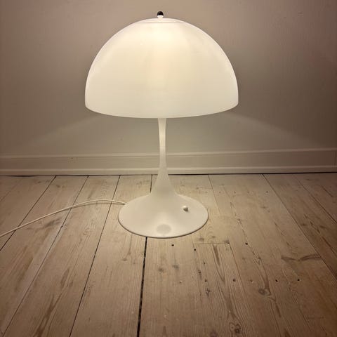 Louis Poulsen Panthella bordlampe designet af Verner Panton. Lampen er en bordlampe i hvid farve med halvkugleformet skærm og trompetformet fod. Den giver et diffust, nedadrettet lys gennem den hvide skærm. Lampen har ledning med afbryder og anvender udskiftelig lyskilde (se mærkat under foden for specifikationer). Velegnet som belysning på bord, skænk eller natbord.