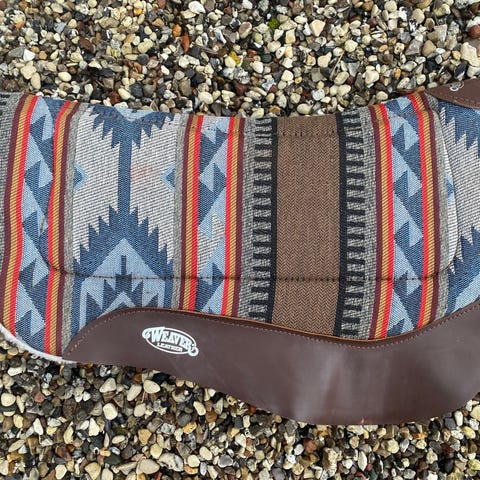 Reinsman western sadelpad i grå uld med læderforstærkninger langs kanterne.