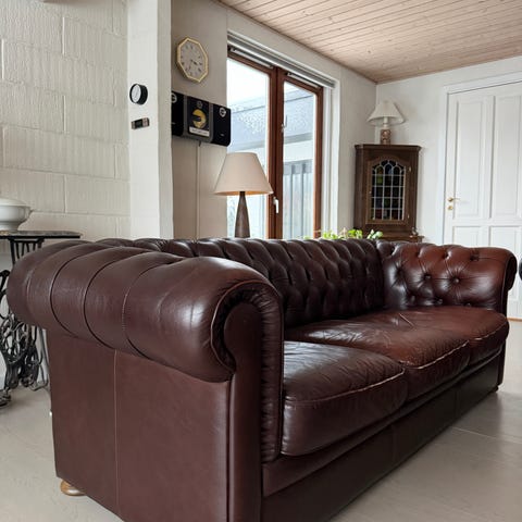 Brun sofa i læder med chesterfield-look og dybe knapper i ryglæn og armlæn. Sofaen har to siddehynder og polstrede armlæn. Overfladen viser almindelige brugsspor i læderet. Velegnet som sofa i stue eller opholdsrum.