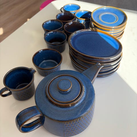 4 kagetallerkner, 6 kagetallerkner, 6 tekopper, 1 kagefad, 1 tekande uden låg.