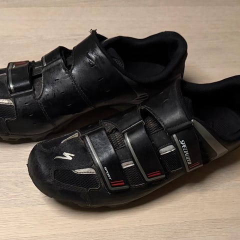 Specialized cykelsko i størrelse 42. Skoene er sorte med justerbart drejespænde og velcrolukning på overdelen. Perforeret overdel for ventilation. Velegnet til landevejscykling eller træning, afhængigt af kompatible pedaler og personlige præferencer. Brugt få gange da de er for smalle.