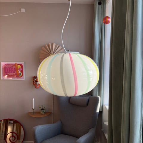 Mundpustet pendel fra 1990'erne i let gulligt gennemsigtigt glas med en hvid, bred stribe der giver et behageligt lys. Perfekt til stue eller spisestuebelysning. pendel er 32 cm høj og ca. 40 cm bred. Fra loft til bunden af pendel: 130 cm. Kan forkortes.
