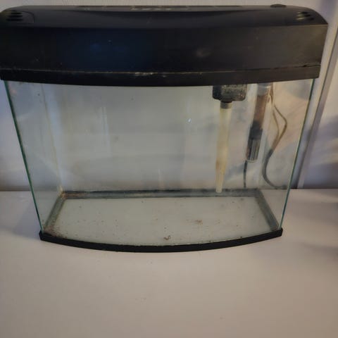 Müller & Pfleger akvarium med rektangulær glasbeholder og sort plastlåg. I låget er der indbygget lysarmatur med plads til lysrør, dette virker dog ikke.