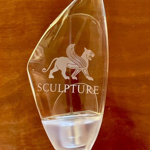 Nikos Sculpture parfume i gennemsigtig glasflakon med skulpturel form. Flasken har indgraveret logo og aftageligt låg. Velegnet til opbevaring og brug af duft. Yderligere oplysninger om indholdsmængde, duftnoter og mål fremgår ikke af billederne.