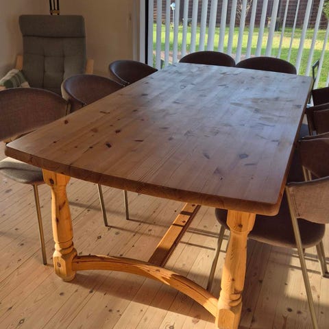 Rektangulært spisebord i træ med massiv træbordplade i lys til mellembrun træfarve. Bordet har en lang, sammenhængende plade velegnet til mange siddepladser, fx i spisestue, mødelokale eller kantine. Overfladen fremstår med synlig træstruktur og staveopbygning. Bordet står på en solid konstruktion (ikke fuldt synlig på billederne) og er egnet til daglig brug, hvor der er behov for et større bordareal. Har 3 stk.