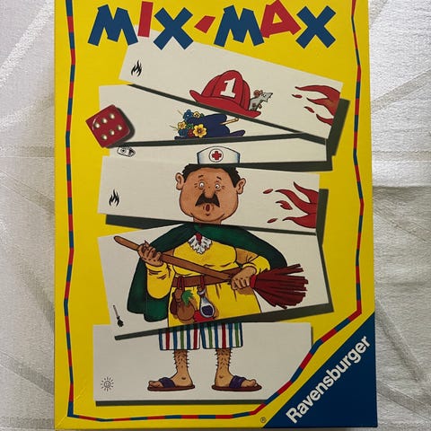 Ravensburger Mix-Max spil. Brætspil/kortspil hvor spillerne sammensætter figurer ved at kombinere forskellige kropsdele på kortene. Spillet egner sig til børn og kan spilles af flere deltagere ad gangen. Tekst på æsken er på flere nordiske sprog, herunder dansk.