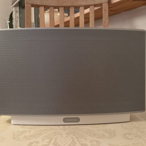 Sonos Play:5 trådløs højttaler i hvid med sort front (Kvittering haves). Højttaleren er beregnet til hjemmet og kan tilsluttes trådløst til hjemmenetværket via Sonos-systemet. Lydkvaliteten er virkelig god og jeg vi har virkelig været glade for at have den. Enheden kan stå både vandret og lodret, som vist på billederne. Velegnet som enkeltstående højttaler eller som del af et multiroom-setup med andre Sonos-enheder.