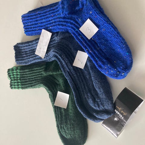 Forskellige størrelser.. og forskelligt garn... Vil mene, de er str. 38-41.. 1 enkelt par.. (de orange), vil jeg mene, de er str. 35 - 36.