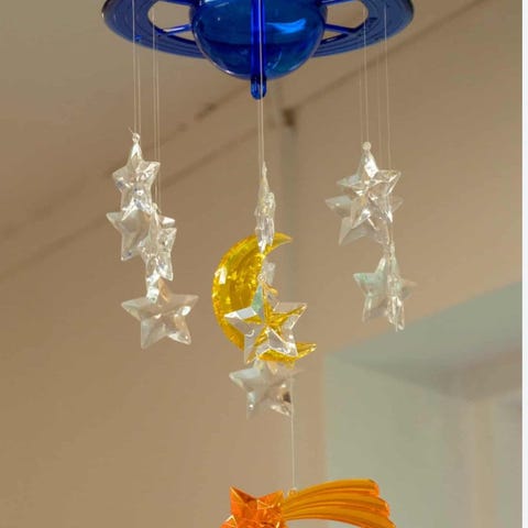 Sødeste vintage IKEA VIMSIG uro med stjerner, raket og måne af Hans Blomquist fra 1990’erne. Der mangler muligvis en stjerne, men ikke noget vi har lagt mærke til før nu hvor den skal videre.