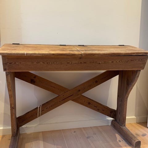 Rustikt charmende skrivebords pult og hattehylde tilhørende
