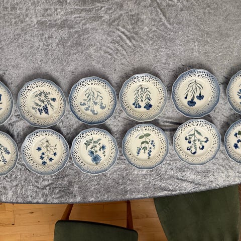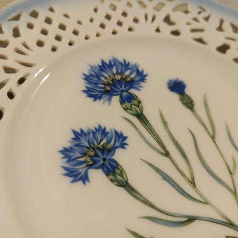 3 Kaj Beckman platter med blå blomster og hul kant. Nr. 1 og 11 Kornblomst og klokkeblomst.