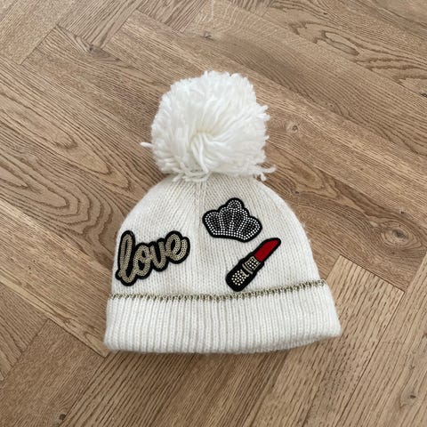 Hjemmestrikket hue i str. 104 til børn. Strikket model i lilla bomuld med grønne detaljer og blad/top øverst. Unisex design, der kan bruges af både drenge og piger. Velegnet til hverdagsbrug i overgangsvejr eller som ekstra lag under yderbeklædning.