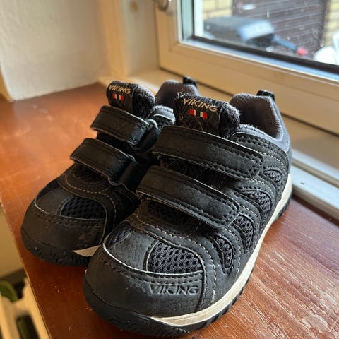 Viking børnesko str. 23 til unisex. Skoene er sorte med hvid mellemsål og sort ydersål med mønster, som giver godt fodfæste. Overdelen er i tekstil og syntetisk materiale med to velcrolukninger, der gør dem nemme at tage af og på. Velegnet som hverdagssko til børn i str. 23.