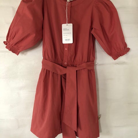 POMPdeLUX kjole til pige i str. 122-128. Kjolen er beige med striber og fremstillet i viskose. Den har korte ærmer og bælte i taljen. Velegnet som hverdags- eller festkjole til børn i den angivne størrelse.