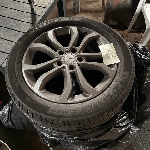 Rigtige fine originale mercedes fælge med helårs dæk på, bagdæk kunne godt trænge til udskiftning men ellers pæne og fine. Trænger til en rengøring. Har enkelt kantkys på venstre fordæk men ellers rigtig pæn stand