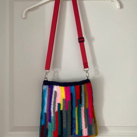 Ny hæklet taske i røde, lyserøde og hvide farver, med lyst for, lukkes med magnetknap, med rød skulderrem, som kan reguleres i længde.