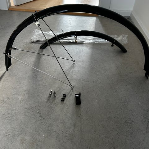 Cykelskærme sæt i sort. Sættet består af for- og bagskærm med tilhørende metalstænger/beslag til montering. Velegnet til montering på cykel for at beskytte mod vand og snavs fra vejbanen. Passer typisk til cykler med plads til fulde skærme; mål og hjulstørrelse bør kontrolleres i forhold til den konkrete cykel.2 sæt skærme det ene er 4,5 cm bred det andet er 5 cm bred begge sæt er til 28 tommer hjul prisen er pr sæt