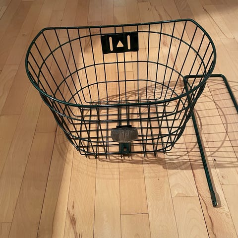 Cykelkurv i sort metalnet til montering foran på cykel. Kurven har beslag til fastgørelse på cykelstel eller styr. Åben netkonstruktion giver god ventilation og mulighed for at se indholdet. Velegnet til transport af mindre tasker, indkøb eller andre hverdagsting på cykelturen.ps det er ikke pæn bulet men ingen huller