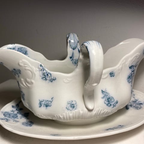 Porcelæn sovseskål med underfad hvid med blomster og guldkant