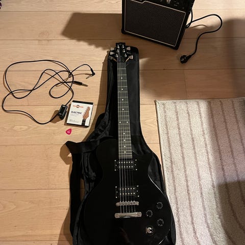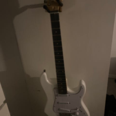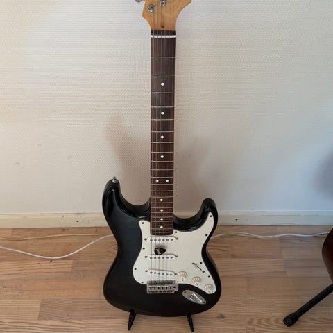 Gear4music venstrehåndet elektrisk guitar i sort med hvid slagplade. Modellen har tre single-coil pickupper, femvejs pickupvælger, volumen- og tonekontroller samt tremolobro. Gribebrættet har dot-inlays, og hovedet er udstyret med seks stemmeskruer på én side. Velegnet som standard elektrisk guitar til øvning og generel brug.