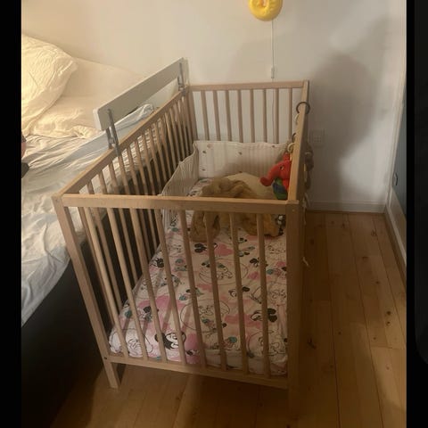 IKEA SNIGLAR tremmeseng i bøgetræ, mål ca. 60x120 cm. Madras medfølger. Tremmesengen er skilt ad men er samme som vist på billedet.